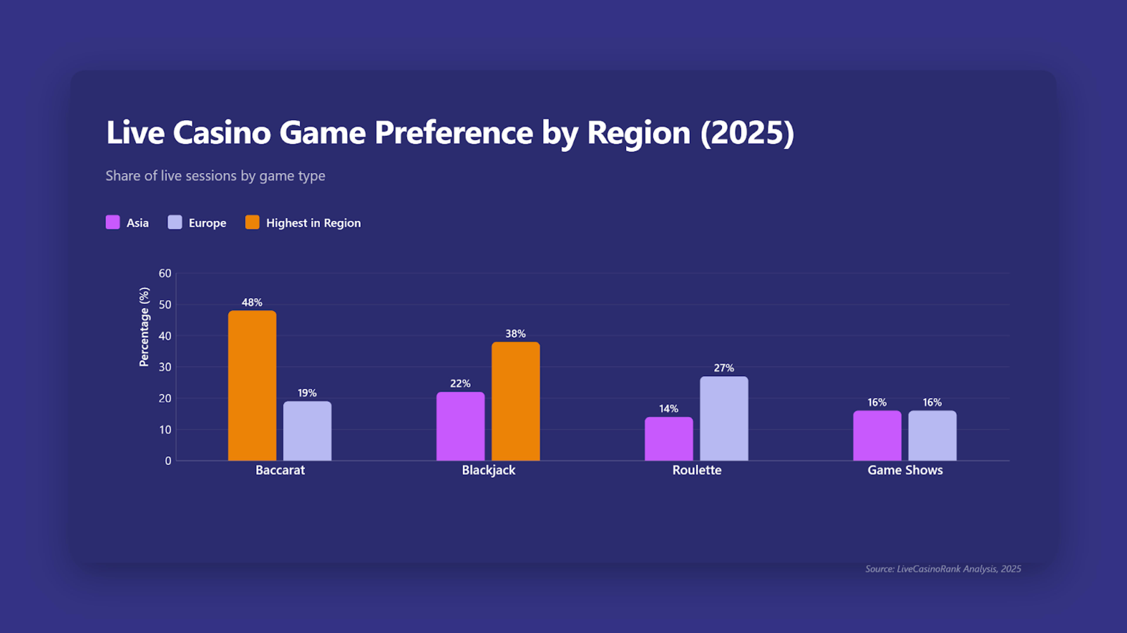 Live session distribution diverged sharply in 2025, with Asia leaning heavily toward baccarat while Europe maintained a stronger preference for blackjack and roulette.