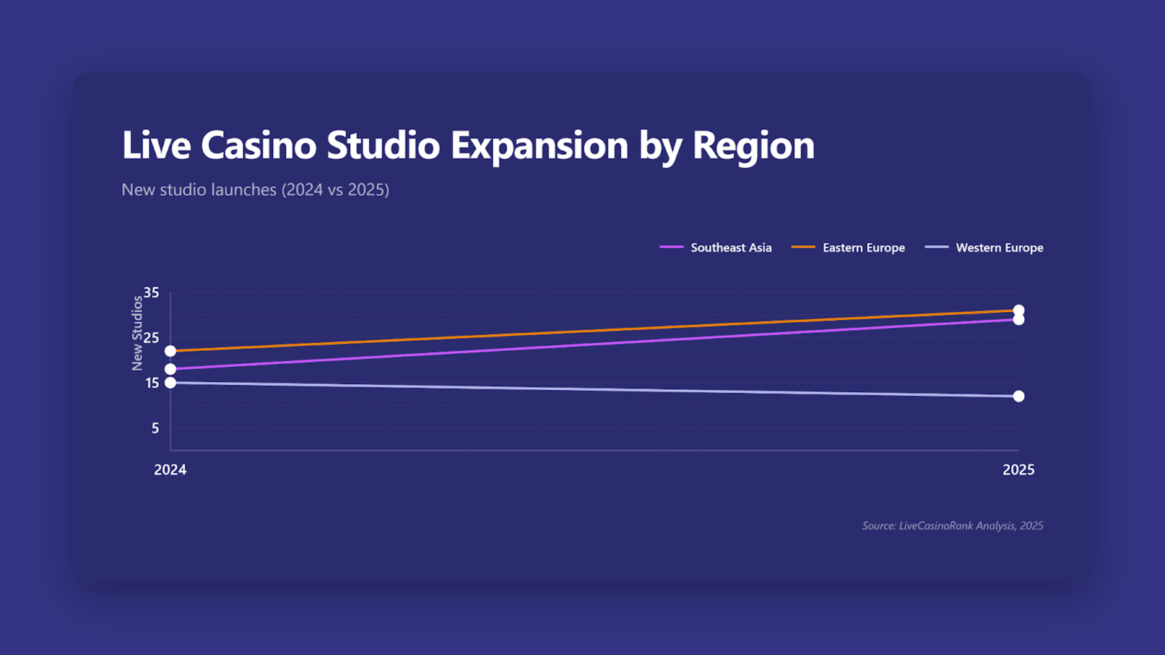 New live casino production facilities are increasingly concentrated in Southeast Asia and Eastern Europe in 2025, while Western Europe saw slower expansion.