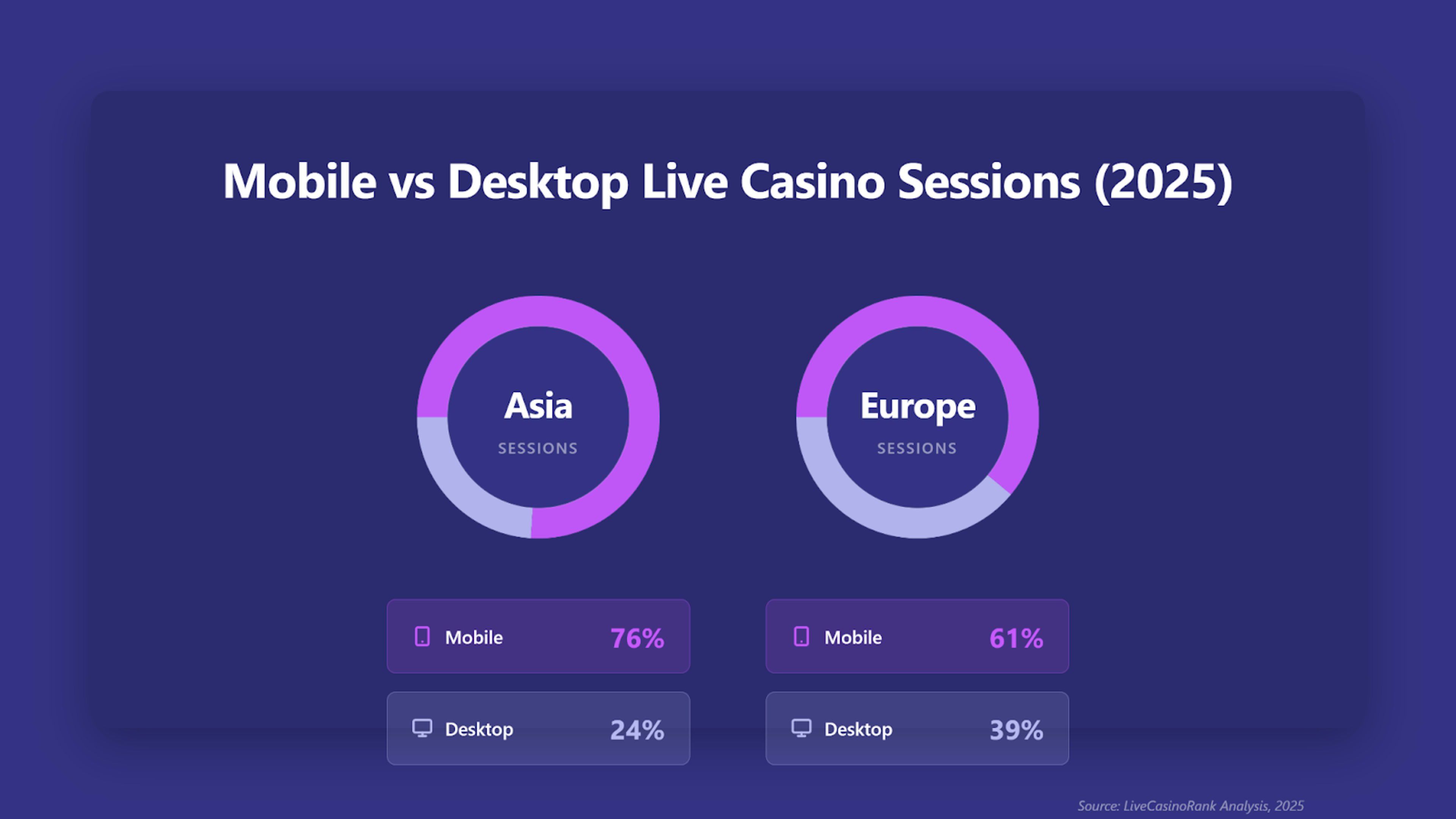 Asia showed a stronger mobile dominance in live casino sessions, reinforcing why studio production and localization are increasingly shifting east.